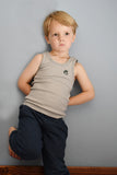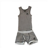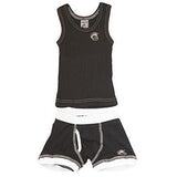 These are so cute it hurts! The Knuckleheads Skivvies retro underwear set includes a classic tank top and boxer brief bottoms. The bottoms have a larger cut for diapers. Wear these under clothing, or alone for loungin. These are made with rib knit fabric and come in a cute gift box, perfect for gift giving! color: brown with ivory trim .