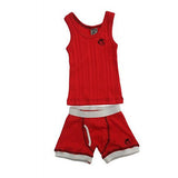 2 piece set in cotton ribbed knit. Brown in color. White trim and white contrast stitching on bottoms. Small embroidered signature logo on top and bottom. Machine wash, tumble dry.