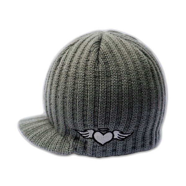 Grey ribbed knit beanie with brim and embroidered Born To Love logo on side.