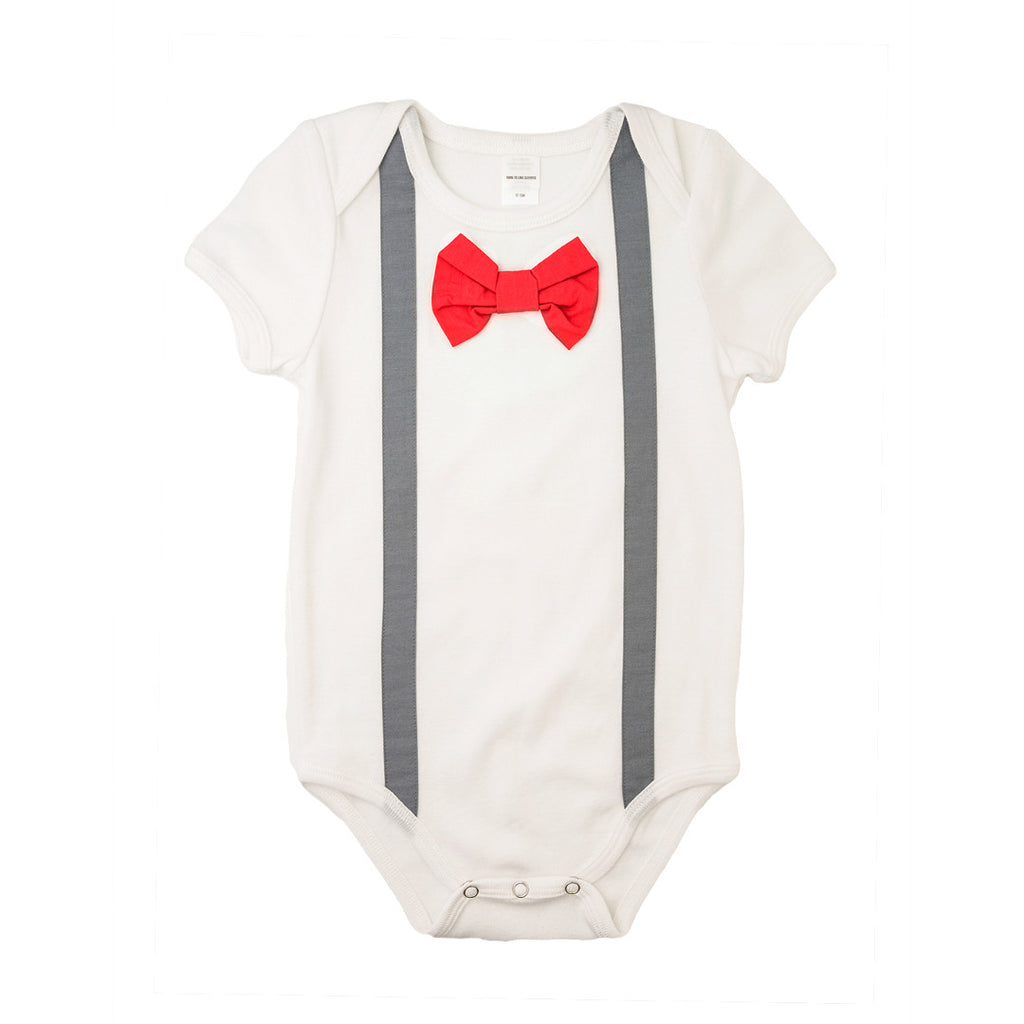 • Grey Suspenders Red Bowtie Bodysuit